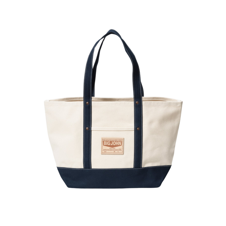 กระเป๋า Tote bag ผ้าแคนวาสในสไตล์ทูโทนจาก Big John ผลิตจากผ้าแคนวาสเนื้อหนาพิเศษ ทอจากเส้นใยฝ้าย 100% ตัวกระเป๋าใช้ผ้าสีธรรมชาติ (Kinari) ร่วมกับสายสี Navy จับคู่สีสุดคลาสสิก ซึ่งผ้าแคนวาสอาจมีการเปลี่ยนสีตามกาลเวลาอันเป็นเอกลักษณ์เฉพาะตัวที่ไม่เหมือนใคร เย็บเดินด้ายและตอกหมุดยึดย้ำในจุดที่ต้องรับน้ำหนัก ช่วยเสริมความแข็งแรงทนทาน มาพร้อมป้ายหนังวัวฟอกปั๊มโลโก้ของทางแบรนด์ มีช่องกระเป๋าเล็กที่ด้านนอกอีกฝั่งอีกละช่อง ภายในมีห่วงตัวหนีบมาให้สำหรับใช้ห้อยพวงกุญแจ ใช้งานได้หลากหลายสถานการณ์ เช่น ช้อปปิ้ง ตั้งแคมป์ และเก็บอุปกรณ์ DIY
