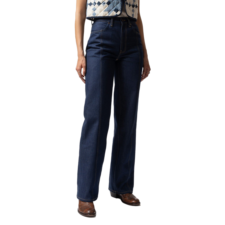 กางเกงยีนส์ของคุณผู้หญิงในทรง Regular Wide Fit ช่วงขากว้างสไตล์ Baggy Jeans ที่ดูผ่อนคลาย แต่ไม่ทิ้งสไตล์ความเท่ มาพร้อมเอวสูงที่ออกแบบมาให้กระชับกับช่วงเอวและสะโพกของผู้หญิง เป้าหน้าเป็นซิป รุ่นนี้ตัดเย็บด้วยผ้าเดนิมน้ำหนัก 13.75oz ทอจาก Organic cotton 100% โดยสีสันของผ้ารุ่นนี้จะออกเป็นเฉดสีน้ำเงินแบบยีนส์ในช่วงยุค 60’s สไตล์ American Blue Jeans ซึ่งจะไม่ได้เข้ม ๆ แบบ Dark indigo นั่นเอง รายละเอียดโดดเด่นมาด้วยการเย็บตะเข็บที่ช่วงหน้าขาตั้งแต่บริเวณกระเป๋าด้านหน้าจรดลงมาจนสุดปลายขา แน่นอนว่าเมื่อสวมใส่จนเฟดก็จะสามารถเกิดร่องรอยตะเข็บขึ้นสวยที่ในส่วนนี้ด้วย