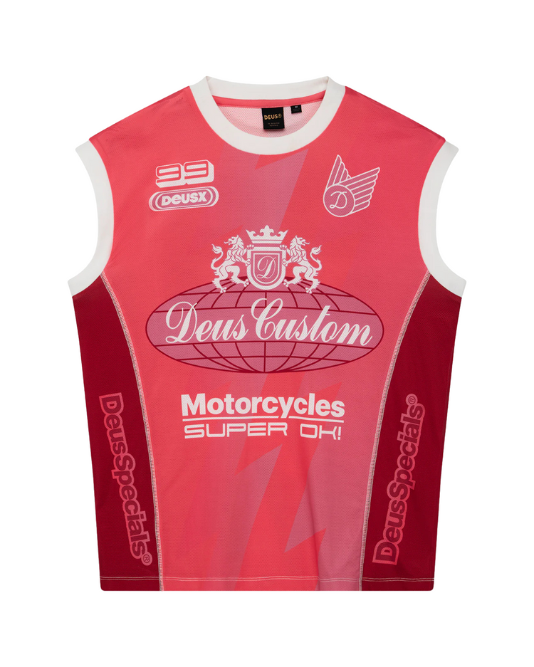 เสื้อกล้าม Moto Tank ผลิตจากผ้า Closed Mesh เนื้อนุ่มและเบาสบาย โดดเด่นด้วยโลโก้อาร์ตเวิร์กคัสตอมของ Deus Ex Machina ในเทคนิค Full Sublimation Print เติมลูกเล่นด้วยดีเทล Midweight Rib บริเวณคอและขอบแขน