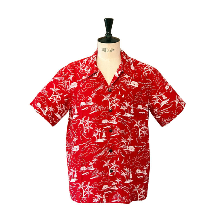 ลายพิมพ์วินเทจชีวิตชายฝั่งในเขตอ่าวไวเมอา บนชายฝั่งทางเหนือของเกาะโออาฮู ผ้าสีแดงปะการังพิมพ์ลายสีขาว