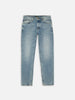 กางเกงยีนส์ทรงเรกูลาร์ ขาตรง ผลิตจากผ้าเดนิมยืดในโทนฟ้าอ่อนที่ให้ลุคซีดนุ่มเหมือนผ่านการใช้งานอย่างพอดี วอชเผยเฉดสีหลากระดับ ตั้งแต่โทนสว่างเกือบขาว ไปจนถึงอินดิโกเข้มที่ถูกเก็บไว้ตามแนวตะเข็บอย่างสวยงาม กระบวนการวอชยังเผยให้เห็นเท็กซ์เจอร์ที่เด่นชัดของเนื้อผ้า ทั้งเส้นด้าย slub แนวตั้ง และลาย crosshatch ที่ช่วยเพิ่มมิติให้กางเกงรุ่นนี้ดูโดดเด่นเป็นพิเศษ