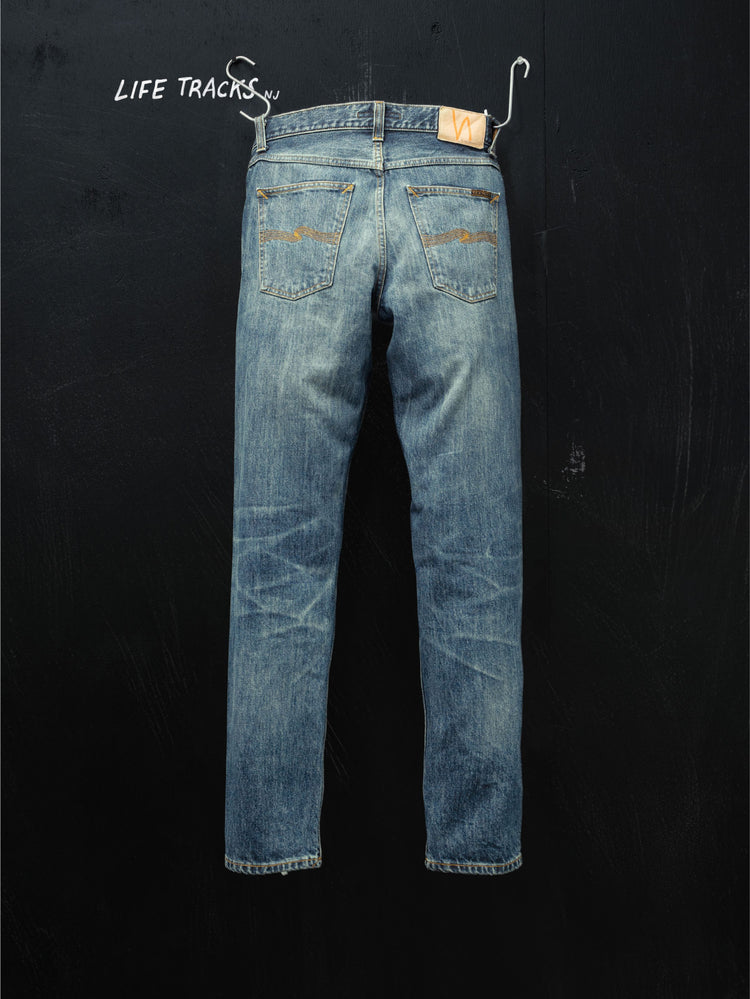 Gritty Jackson Thriller Tracks ถูกสร้างขึ้นเพื่อจำลองรอยเฟดและร่องรอยการสวมใส่จากกางเกง Nudie Jeans ตัวต้นแบบอย่างแม่นยำ ทุกจุดถูกเก็บรายละเอียดและถ่ายทอดลงบนยีนส์ตัวใหม่อย่างครบถ้วน